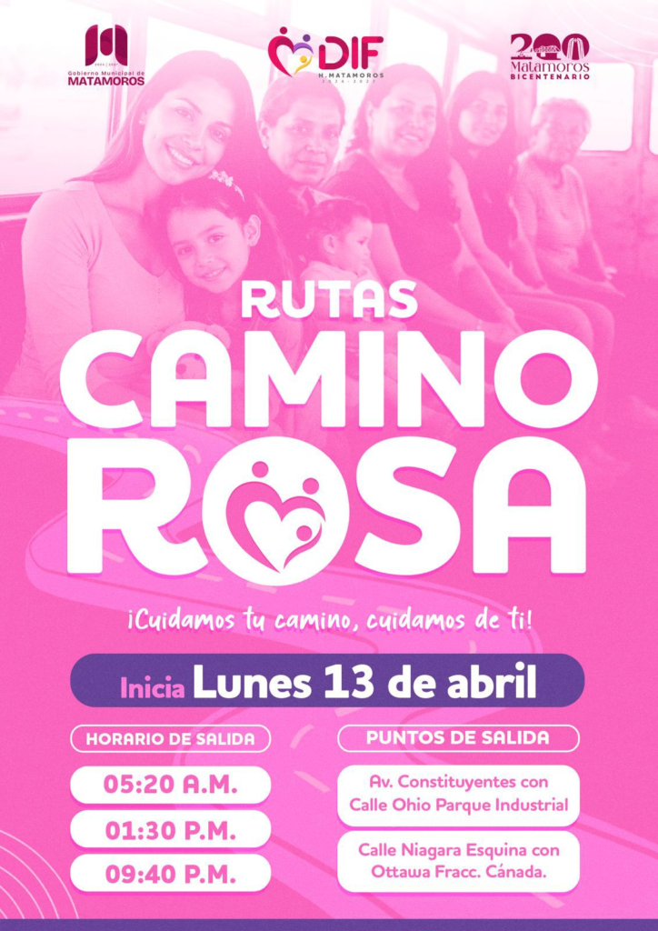 A través del Sistema DIF Matamoros, llega Rutas Camino Rosa, un servicio de transporte pensado especialmente para mujeres y niñas y niños menores, que busca brindar traslados más seguros y confiables en tu día a día.