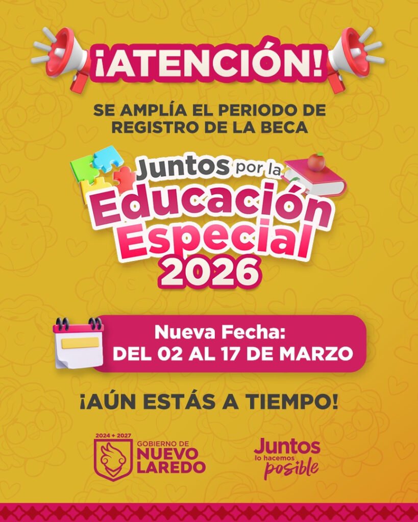 El Gobierno Municipal de Nuevo Laredo informa que se amplió hasta el 17 de marzo de 2026 la fecha límite para registrarse a la Beca “Juntos por la Educación Especial 2026”, con el propósito de que más estudiantes puedan acceder a este apoyo.