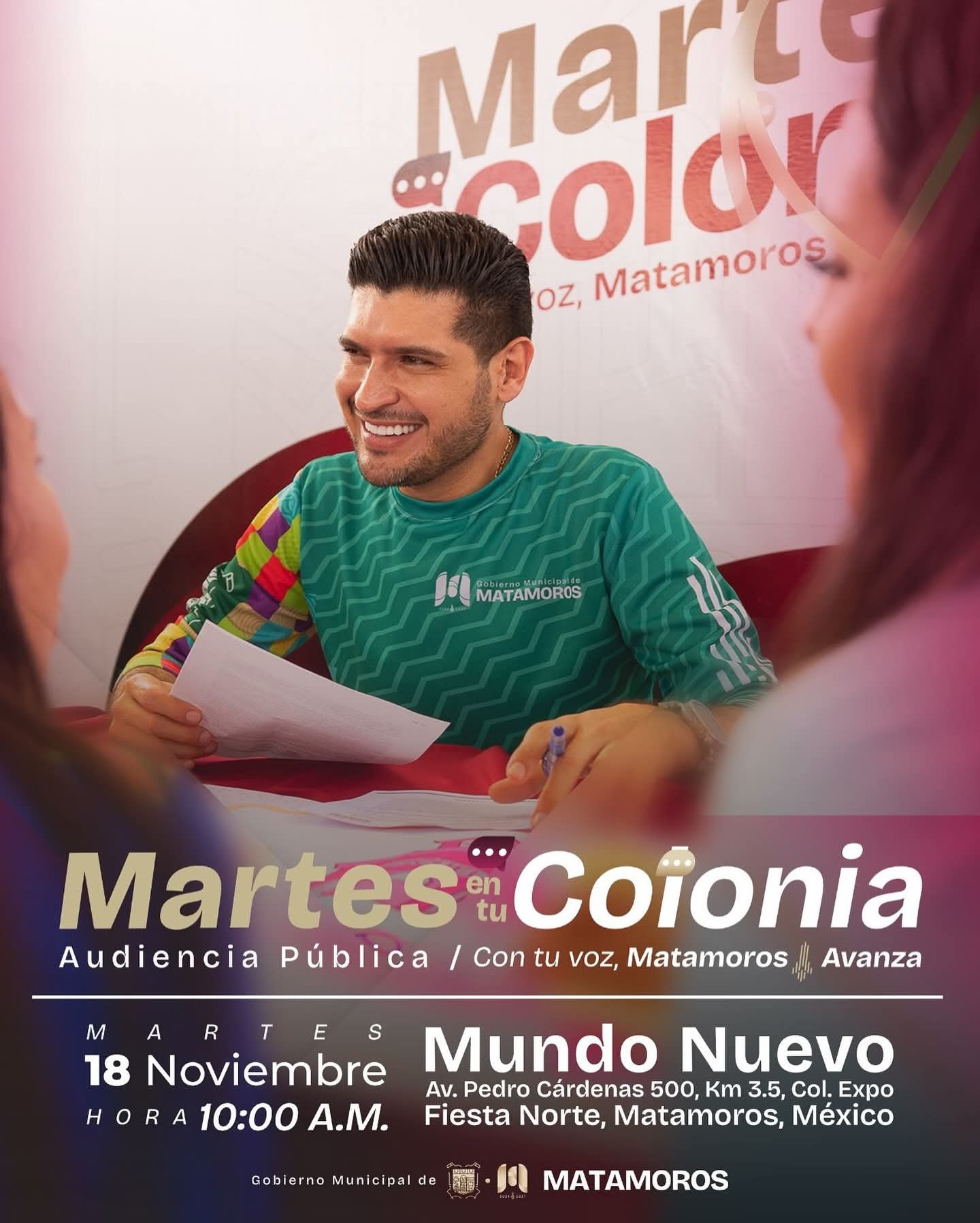 El alcalde Beto Granados encabezará este martes 18 de noviembre una nueva jornada del programa “martes en tu colonia’, que se llevará a cabo en las instalaciones del Centro de Convenciones Mundo Nuevo a partir de las 10:00 de la mañana, con el propósito de acercar los principales servicios municipales a las familias matamorenses.