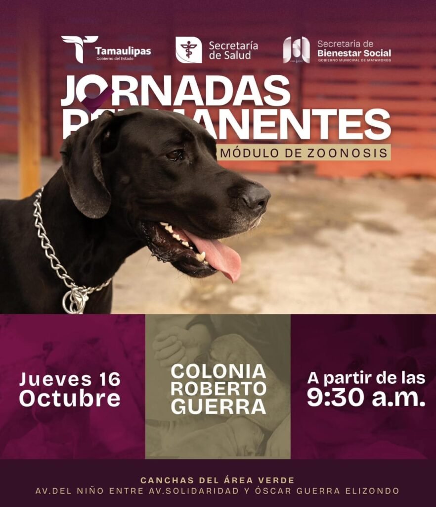 En cumplimiento del compromiso con el bienestar de las familias, este jueves 16 de octubre el Módulo de Zoonosis estará brindando atención en la colonia Roberto Guerra, a partir de las 9:30 de la mañana, en las canchas del área verde ubicada en Avenida del Niño entre Av. Solidaridad y Oscar Guerra Elizondo.