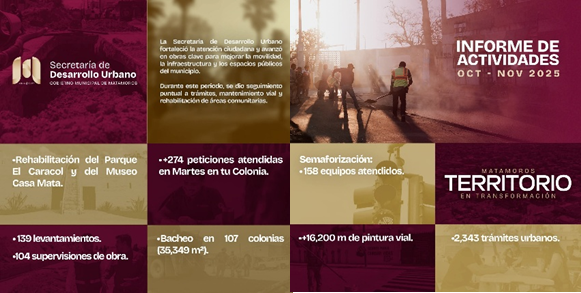 Bajo el liderazgo del alcalde de Matamoros, Beto Granados, la Secretaría de Desarrollo Urbano fortaleció la atención ciudadana y avanzó en obras estratégicas que mejoran la movilidad, la infraestructura y los espacios públicos del municipio, con una visión clara de transformación y desarrollo para que brille Matamoros.