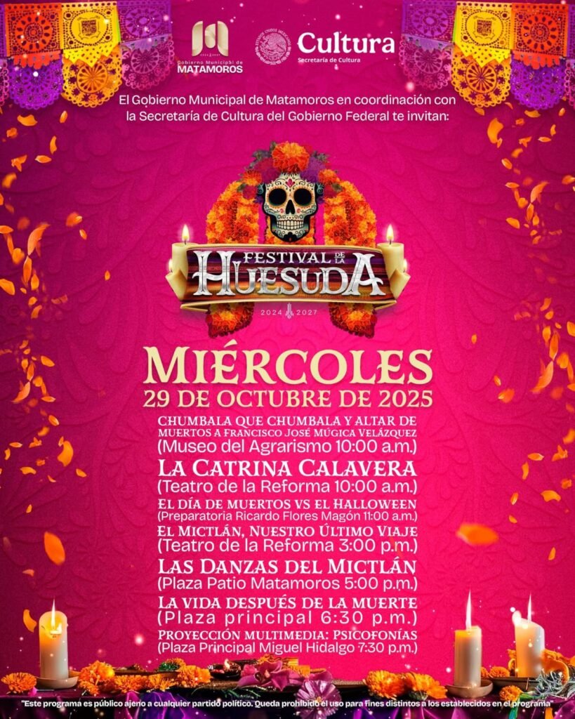 Matamoros continúa viviendo con entusiasmo el Festival de la Huesuda 2025, una celebración que envuelve a la ciudad con el brillo de las velas, el aroma del cempasúchil y el arte en cada rincón. En el marco de esta colorida festividad, el Gobierno de Beto Granados invita a la ciudadanía a disfrutar de una jornada especial este miércoles 29 de octubre, llena de actividades que rinden homenaje a la vida, la memoria y nuestras tradiciones mexicanas.