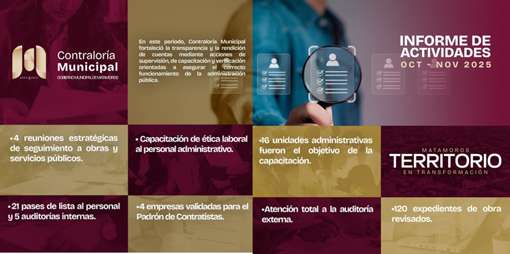 En seguimiento a la visión de trabajo impulsada por el alcalde de Matamoros, Beto Granados, la Contraloría Municipal reforzó los procesos de supervisión, capacitación y verificación con el objetivo de garantizar el correcto funcionamiento de la administración pública y el adecuado uso de los recursos municipales.