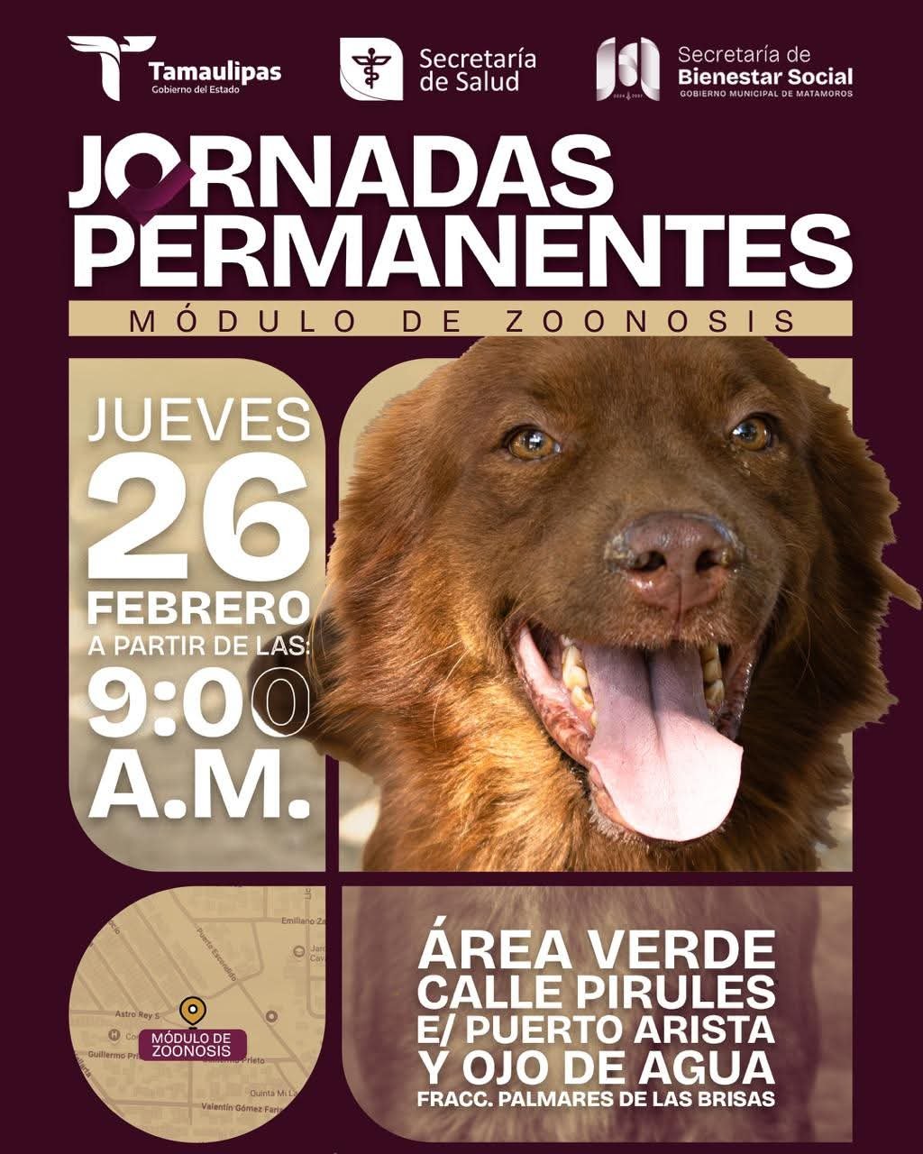 Este jueves se llevará a cabo la Jornada Permanente del Módulo de Zoonosis en el área verde del Fraccionamiento Palmares de las Brisas, ubicada en Calle Pirules entre Puerto Artista y Ojo de Agua.