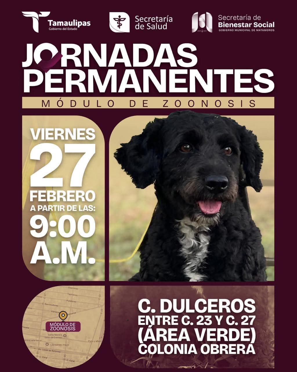 Este viernes 27 de febrero, a partir de las 9:00 a.m., las Jornadas Permanentes del Módulo de Zoonosis estarán brindando atención en la C. Dulceros, entre C. 23 y C. 27 (Área Verde), en la colonia Obrera.