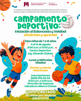 El Centro Deportivo Ing. Eduardo Chávez convoca a niñas y niños de 7 a 13 años a formar parte de su Campamento de Verano, que se llevará a cabo del 4 al 14 de agosto.