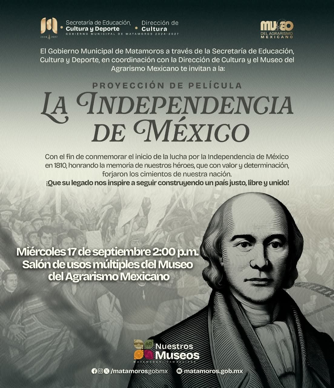 El Gobierno Municipal que encabeza Beto Granados invita a la comunidad de Matamoros a participar en una emotiva actividad cultural con motivo de las celebraciones patrias: la proyección especial de la película “La Independencia de México”, un homenaje audiovisual al inicio del movimiento que marcó el rumbo de nuestra nación.