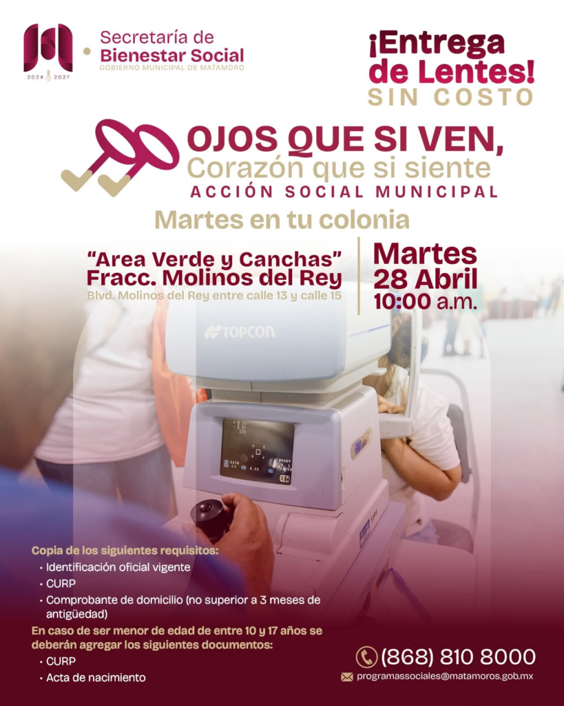 Este martes, durante el “Martes en tu Colonia”, la jornada llegará al área verde y canchas del Fraccionamiento Molinos del Rey, acercando este beneficio para que más personas puedan acceder a una mejor salud visual y continuar realizando sus actividades diarias con mayor bienestar.