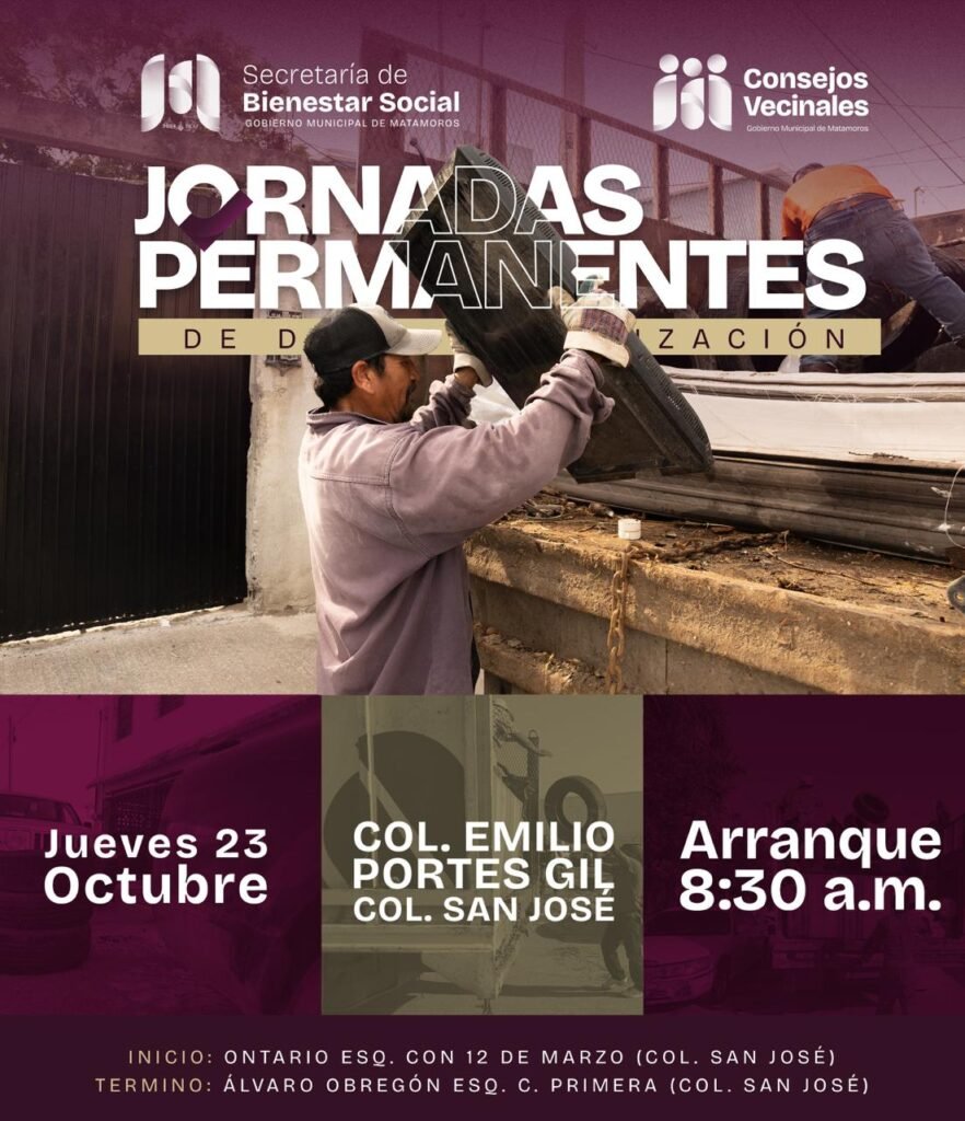 La jornada iniciará a las 8:30 de la mañana, partiendo desde Ontario esquina con 12 de Marzo, en la colonia San José, y concluirá en Álvaro Obregón esquina con Calle Primera, del mismo sector. Se invita a las y los vecinos a sacar muebles viejos, cacharros y objetos en desuso para mantener sus hogares y calles limpias.