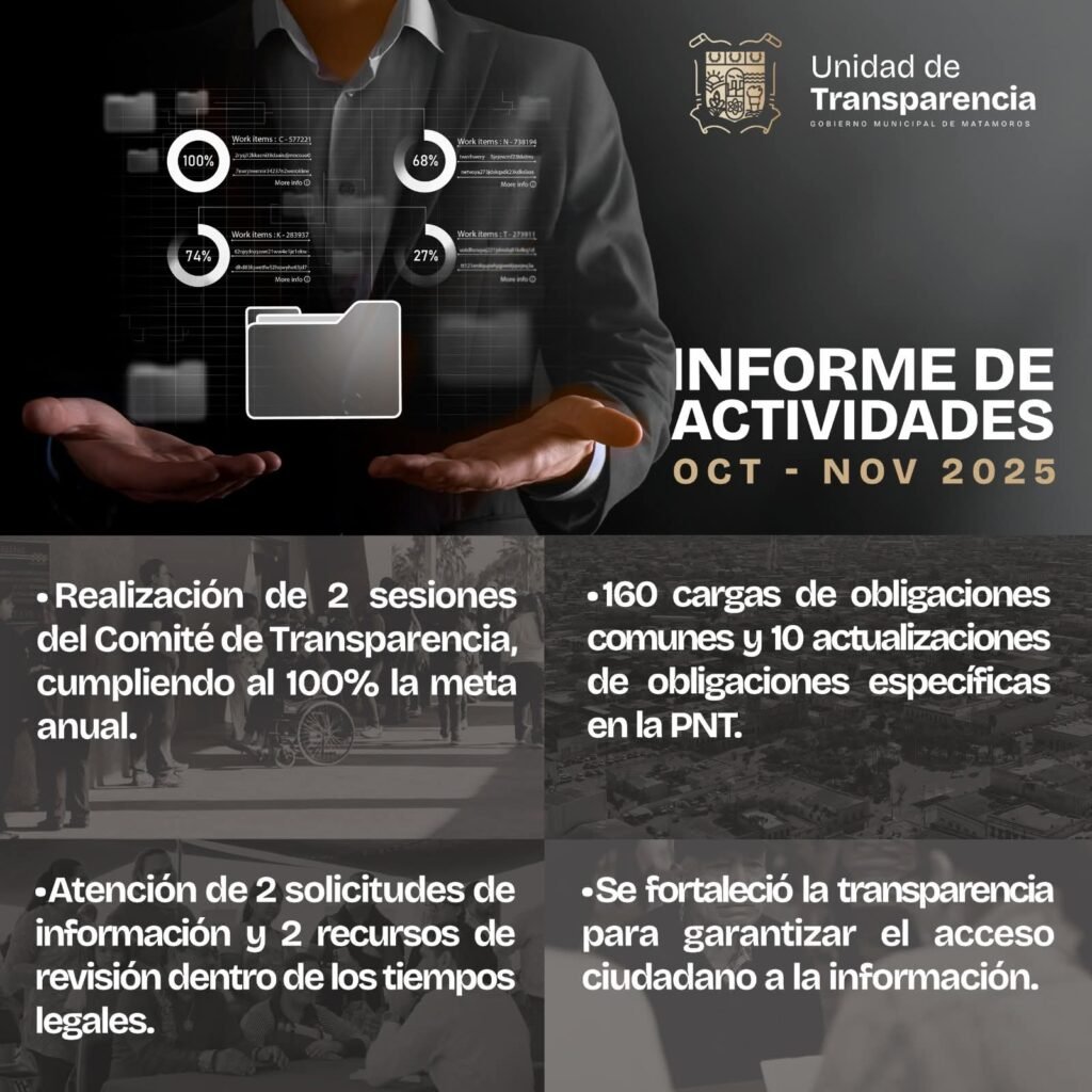 Durante el periodo evaluado, se llevaron a cabo dos sesiones del Comité de Transparencia, se realizaron 160 cargas de obligaciones comunes en la Plataforma Nacional de Transparencia y se efectuaron 10 actualizaciones de obligaciones específicas, garantizando el cumplimiento de la normatividad vigente y el acceso oportuno a la información, para que brille Matamoros con un gobierno claro y ordenado.