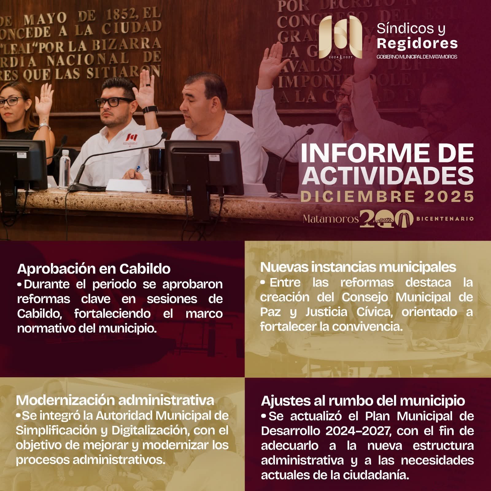 El Gobierno de Beto Granados resaltó el trabajo realizado por síndicos y regidores durante el mes de diciembre, quienes impulsaron acciones orientadas a fortalecer la vida pública del municipio, asegurando que las decisiones de gobierno respondan a las necesidades actuales de la ciudadanía en Matamoros.
