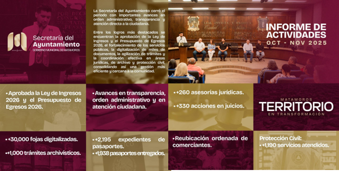 Estas acciones forman parte de una visión integral de gobierno que busca modernizar la administración pública municipal y responder de manera efectiva a las necesidades de la comunidad, bajo el lema Que Brille Matamoros, promoviendo una gestión ordenada y responsable.