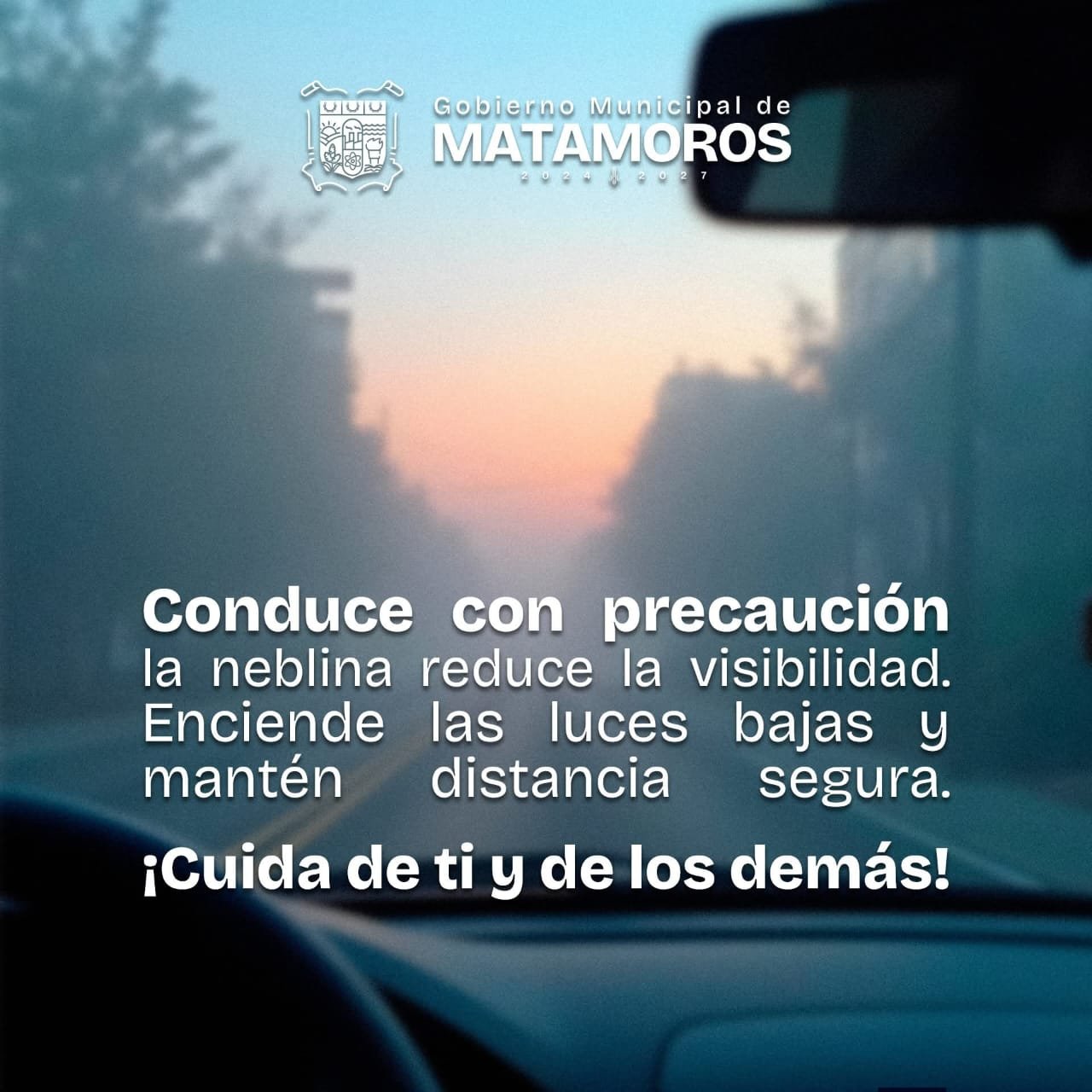 Ante la presencia de neblina en distintos puntos de la ciudad, el Gobierno Municipal de Matamoros, encabezado por el alcalde Beto Granados, exhorta a la ciudadanía a extremar precauciones al conducir, ya que estas condiciones reducen considerablemente la visibilidad.