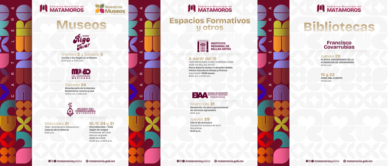 Como parte de esta estrategia, se han activado bibliotecas, museos y espacios formativos, los cuales se han convertido en puntos clave para el aprendizaje y la convivencia. Talleres, charlas, actividades infantiles, exposiciones y programas educativos se desarrollan en recintos como bibliotecas públicas, museos históricos y artísticos, así como en instituciones dedicadas a la enseñanza de las bellas artes, consolidando espacios formativos que hoy permiten que brilla Matamoros desde la educación y la cultura.