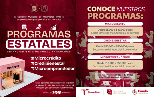 Estas alternativas forman parte de la coordinación entre el Gobierno del Estado de Tamaulipas, la Secretaría de Economía y Fondo Tamaulipas, sumándose a las acciones del Gobierno de Matamoros para impulsar el emprendimiento y el desarrollo productivo de la ciudad.