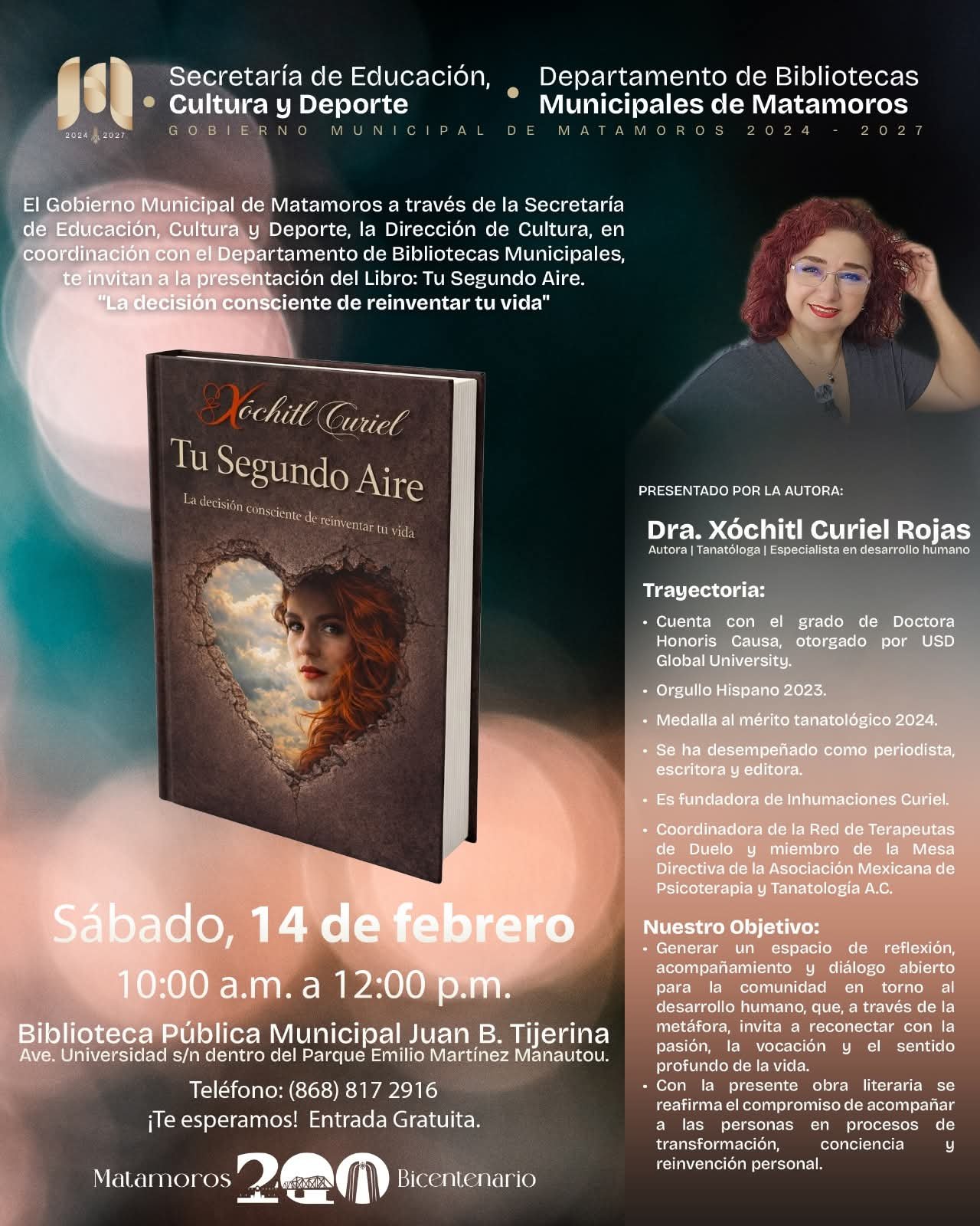 En este contexto, el próximo sábado 14 de febrero, la Biblioteca Pública Municipal Juan B. Tijerina abrirá sus puertas para la presentación del libro “Tu Segundo Aire”, de la autora Dra. Xóchitl Curiel Rojas, una obra que invita a reconectar con el sentido de la vida, la vocación y los procesos de transformación personal.