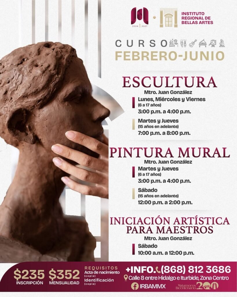 El Gobierno Municipal de Matamoros, encabezado por el alcalde Beto Granados, continúa fortaleciendo la oferta cultural en la ciudad mediante la apertura de inscripciones a diversos cursos artísticos en el Instituto Regional de Bellas Artes Matamoros.