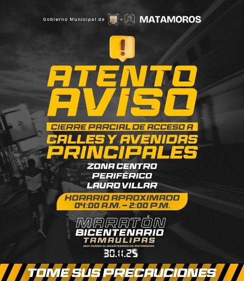 El Gobierno Municipal que encabeza Beto Granados informa que, con motivo del Maratón Bicentenario Tamaulipas 2025: Rumbo al Bicentenario de Matamoros, se llevarán a cabo cierres parciales en diversas calles y avenidas principales de la ciudad este sábado 30 de noviembre.