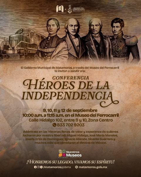El gobierno de Beto Granados extiende una cordial invitación a la ciudadanía para asistir a la conferencia “Héroes de la Independencia”, que se llevará a cabo del 9 al 12 de septiembre en el Museo del Ferrocarril de Matamoros. La actividad se desarrollará en un horario de 10:00 a.m. a 11:15 a.m., y tiene como objetivo fomentar la reflexión sobre la historia y el legado de quienes lucharon por la libertad de México.