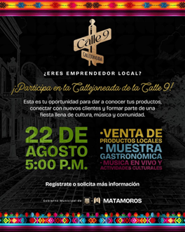 El Gobierno Municipal de Matamoros, encabezado por el presidente Beto Granados, invita a toda la ciudadanía a disfrutar de la gran reinauguración de “La Callejoneada de la Calle 9”, un espacio emblemático que celebra nuestra cultura, música y tradición.