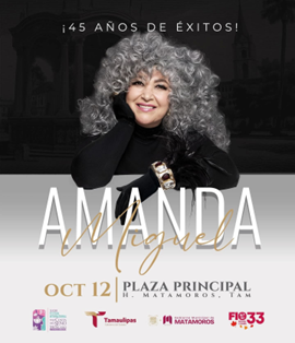 El Gobierno Municipal de Matamoros, que encabeza el alcalde Beto Granados, invita a toda la ciudadanía a disfrutar del gran concierto de Amanda Miguel, reconocida artista internacional que llegará a esta ciudad para engalanar la clausura del Festival Internacional de Otoño.