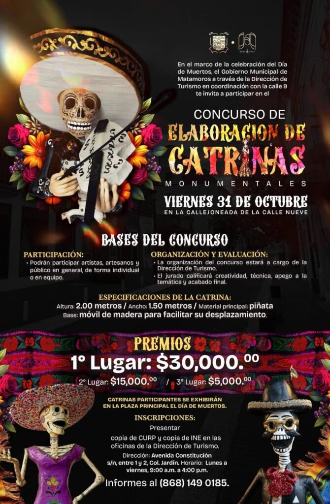 El Gobierno de Matamoros que encabeza el alcalde Beto Granados, a través de la Dirección de Turismo y en coordinación con La Calle 9, informó la convocatoria para participar en el Concurso de Catrinas Monumentales, en el marco de la celebración del Día de Muertos.