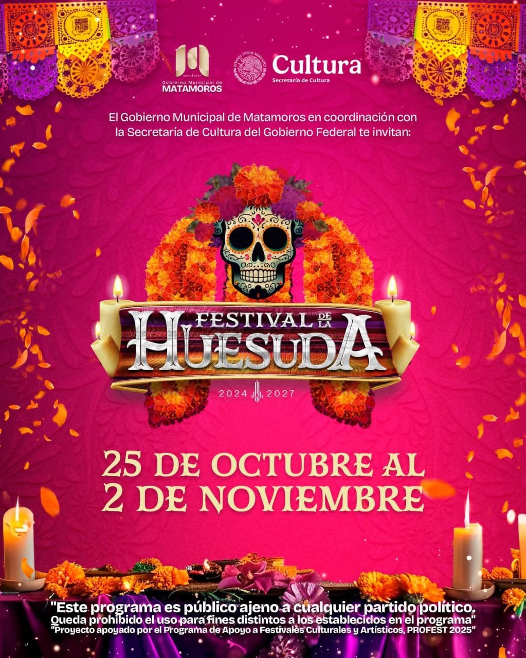 El Gobierno de Beto Granados invita a disfrutar del Festival de la Huesuda 2025, una celebración que honra nuestras raíces y mantiene viva la tradición del Día de Muertos. Del 25 de octubre al 2 de noviembre, Matamoros se vestirá de colores, aromas y recuerdos para rendir homenaje a quienes nos acompañan desde otra dimensión.