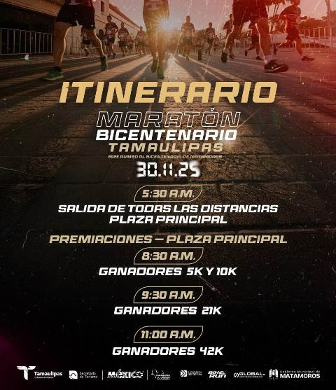 El Gobierno de Matamoros invitó a la ciudadanía a participar corriendo, apoyando o simplemente disfrutando del ambiente festivo que caracteriza este tipo de eventos. El Maratón Bicentenario Tamaulipas 2025 no solo busca promover el deporte, sino también fortalecer la identidad y el orgullo de la comunidad en un año histórico para la entidad.