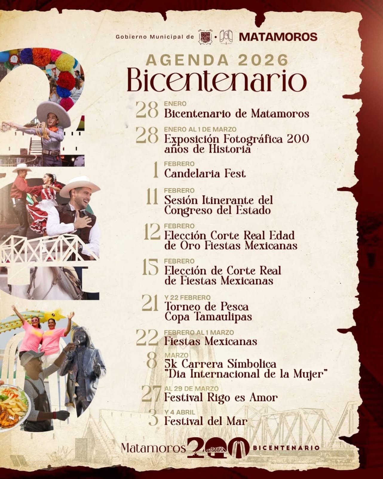 Dentro de la Agenda 2026 del Bicentenario destacan eventos emblemáticos como la celebración oficial del Bicentenario de Matamoros el próximo 28 de enero, así como la Exposición Fotográfica “200 años de Historia”, que estará abierta del 28 de enero al 01 de marzo. También se incluyen festividades tradicionales como la Candelaria Fest, la Sesión Itinerante del Congreso del Estado, la elección de la Corte Real de las Fiestas Mexicanas y el Torneo de Pesca Copa Tamaulipas, además de las propias Fiestas Mexicanas que se desarrollarán a finales de febrero.