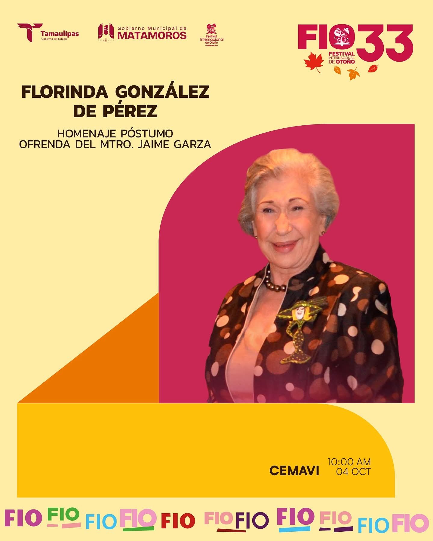 El Gobierno Municipal de Matamoros, encabezado por el alcalde Beto Granados, invita a la ciudadanía a participar en un emotivo homenaje póstumo en honor a la Sra. Florinda González de Pérez, Presidenta Fundadora del Festival Internacional de Otoño (FIO). Este acto se realizará en el marco de la 33ª edición de dicho festival, como un reconocimiento a su invaluable aportación al desarrollo cultural de la ciudad.