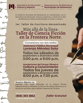 El Gobierno de Beto Granados informó la puesta en marcha del Primer taller de escritura: “Más allá de la línea: Taller de Ciencia Ficción en la Frontera Norte”, una propuesta cultural que busca impulsar la creatividad de las y los matamorenses a través de la lectura y la escritura.