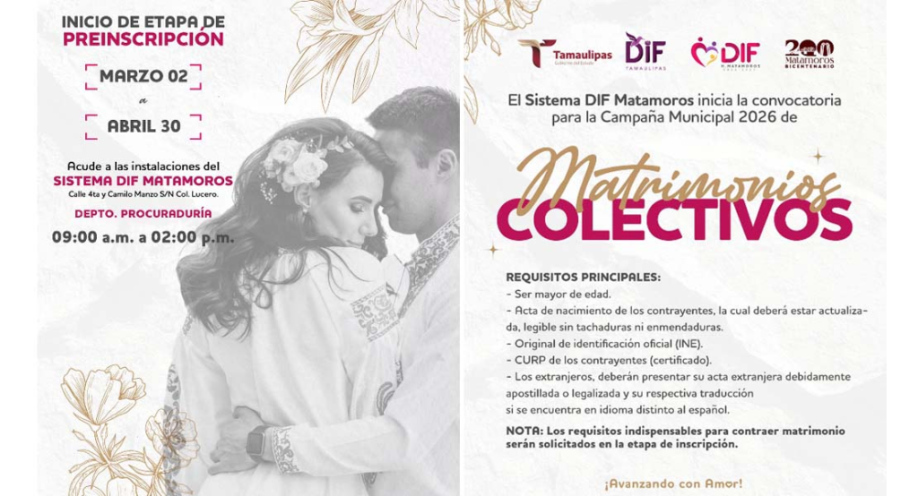 El Sistema DIF Matamoros que encabeza la Lic. Ana Ariceaga de Granados en coordinación con el Sistema DIF Estatal, abren la convocatoria dirigida a todas las parejas interesadas en contraer nupcias y formar parte de la Campaña Municipal de “Matrimonios Colectivos 2026”.