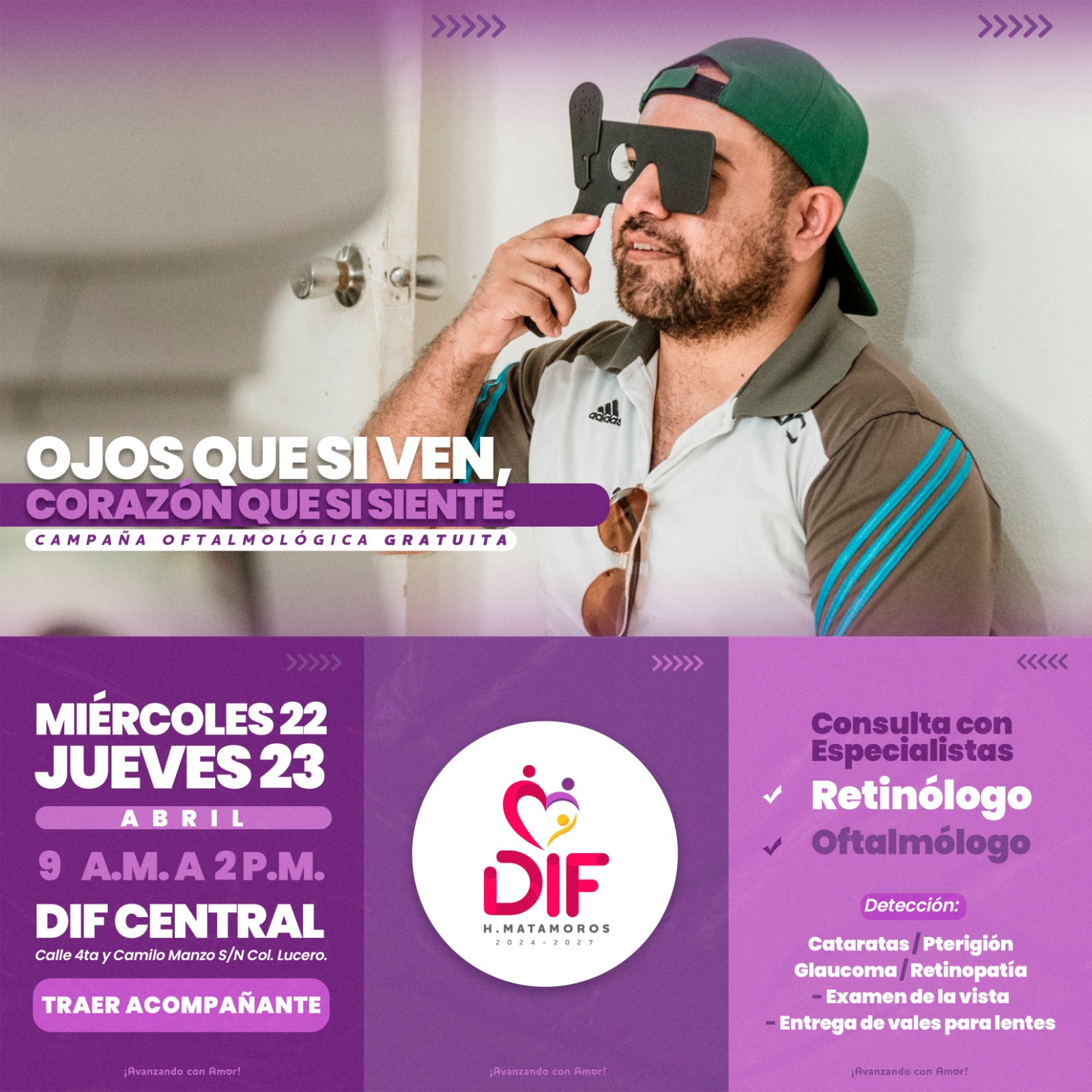 Las valoraciones se llevarán a cabo el próximo miércoles 22 y jueves 23 de abril, en las instalaciones de la oficina central de DIF Matamoros que se ubica en en Calle 4ta y Camilo Manzo Col. Lucero, en horario de 09:00 a.m. a 02:00 p.m. Durante este espacio se ofrecerán servicios de examen de la vista, consulta oftalmológica, consulta con especialista retinólogo, así como detección de cataratas, ptregión, glaucoma, retinopatía, además de entrega de vales para lentes.