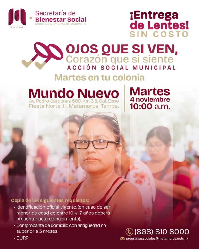 La entrega de lentes se llevará a cabo este martes 4 de noviembre a partir de las 10:00 de la mañana en el Centro de Convenciones Mundo Nuevo. Se invita a los asistentes a acudir con la documentación requerida para poder acceder al beneficio y aprovechar esta oportunidad gratuita que busca cuidar la salud ocular de los matamorenses.