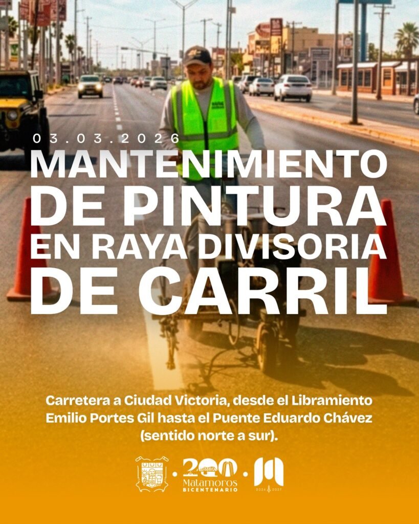 🚧 El Gobierno de Matamoros informa que se estarán realizando trabajos de pintura de líneas viales en diferentes avenidas de la ciudad. Estas acciones forman parte del cumplimiento del ordenamiento vial y tienen como objetivo brindar mayor seguridad tanto a los conductores 🚗 como a los peatones 🚶♀️.