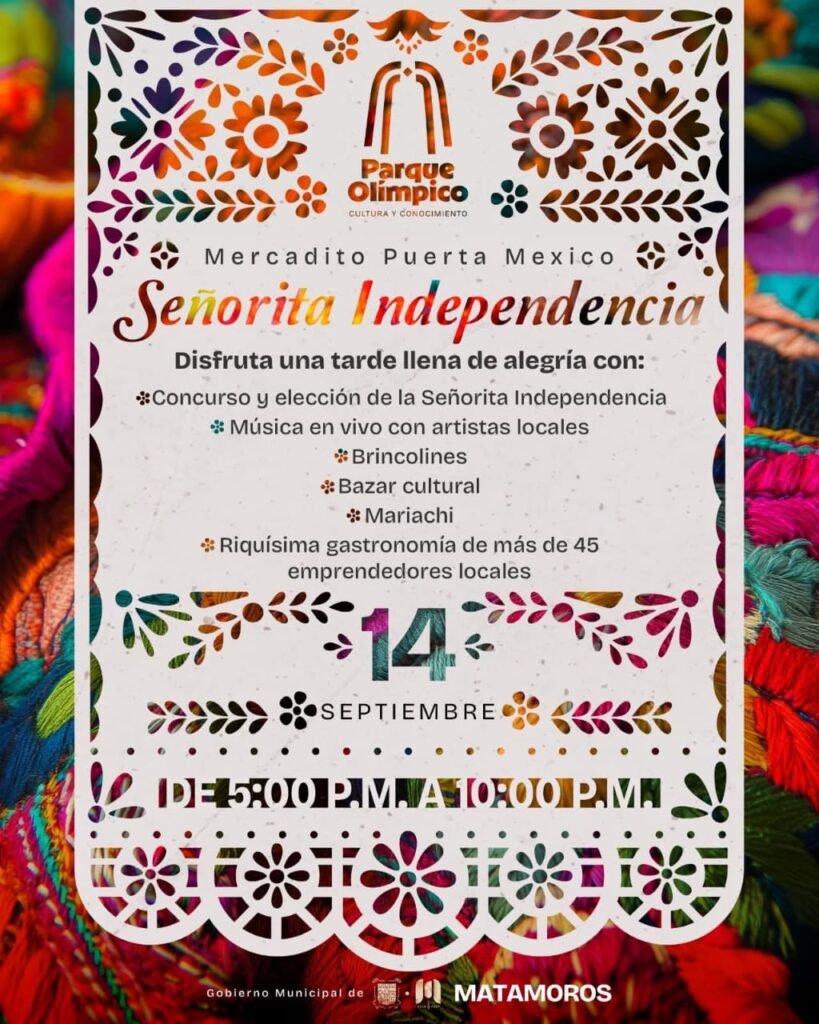 El Gobierno Municipal de Matamoros, que preside el alcalde Beto Granados, invita a la ciudadanía a disfrutar de una tarde especial este 14 de septiembre en el Parque Olímpico, con la tradicional elección de Señorita Independencia.