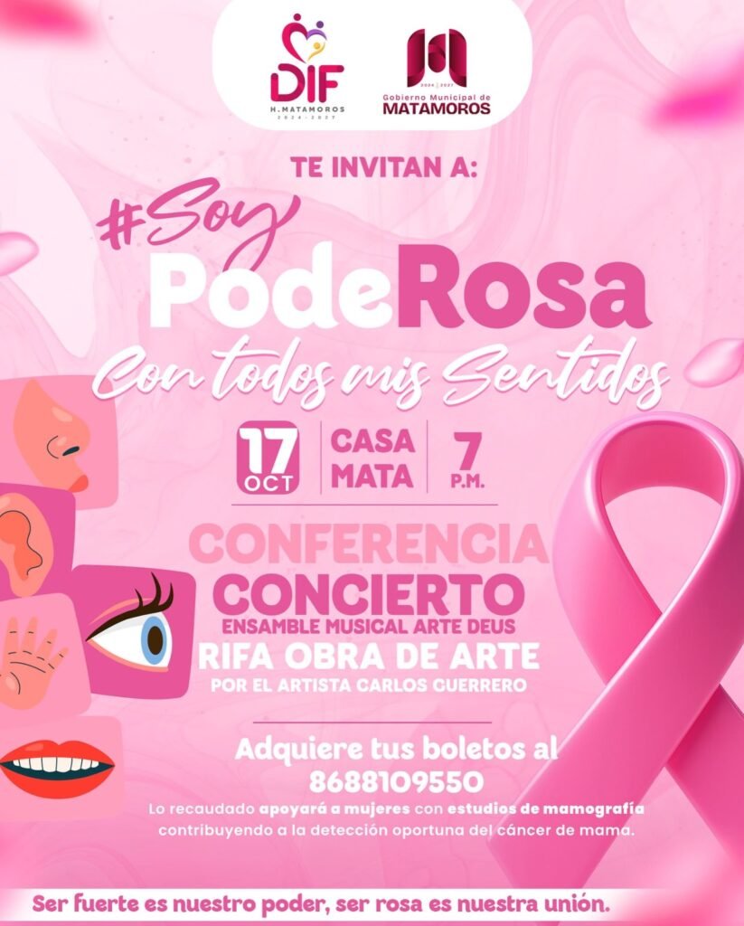 En apoyo al mes de Sensibilización sobre el Cáncer de Mama, el Sistema DIF Matamoros llevará a cabo la conferencia-concierto “Con todos mis Sentidos” bajo la iniciativa #SoyPodeRosa. El evento reunirá arte, música y reflexión para recaudar fondos destinados a estudios de mastografía para mujeres.