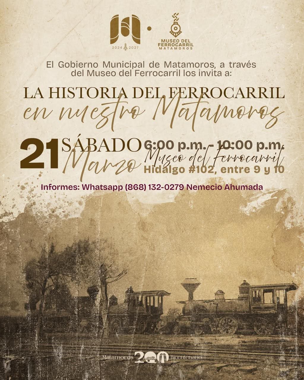 📅 Sábado 21 de marzo, de 6:00 p.m. a 10:00 p.m., en el Museo Del Ferrocarril de Matamoros, ubicado en Hidalgo #102, entre 9 y 10.